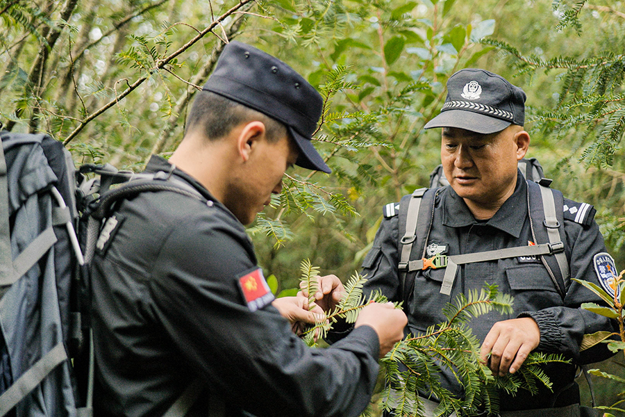 Plants are inspected by officers in a Chinese yew forest on the mountain. HOU WEIJING/FOR CHINA DAILY