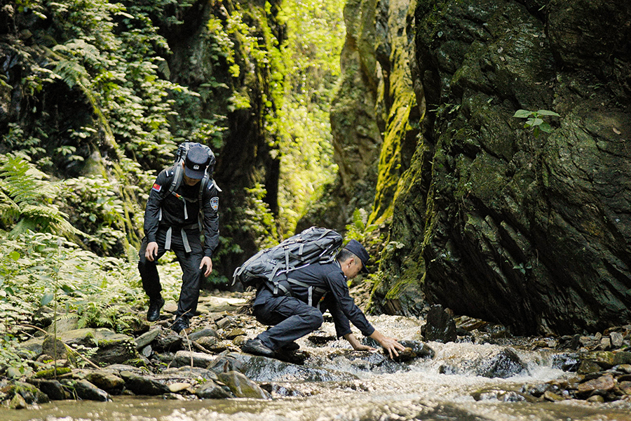 Officers fetch water from a stream during a patrol on Dazhong Mountain. HOU WEIJING/FOR CHINA DAILY