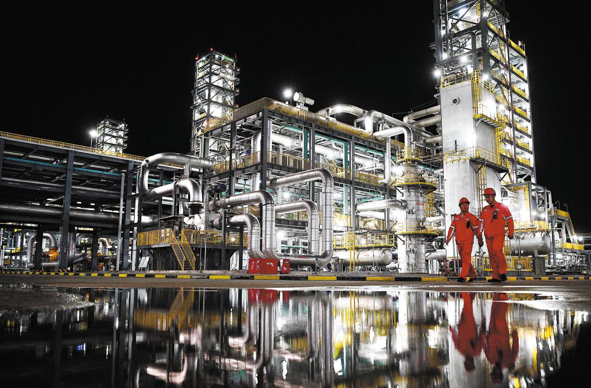 Technicians from China National Petroleum Corp conduct an inspection at a natural gas processing facility of Changqing oilfield in Yulin, Shaanxi province, in July. WANG PENG/XINHUA