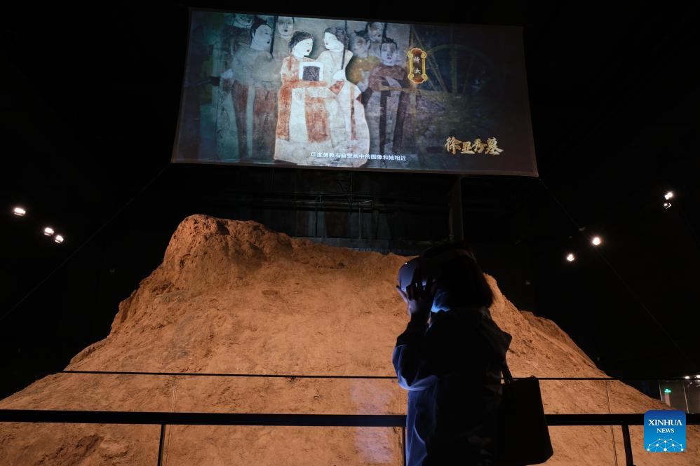A visitor appreciates murals using a VR device at Taiyuan Northern Qi Dynasty Mural Museum in Taiyuan, capital of north China's Shanxi Province, May 8, 2023. (Xinhua/Tang Shining)