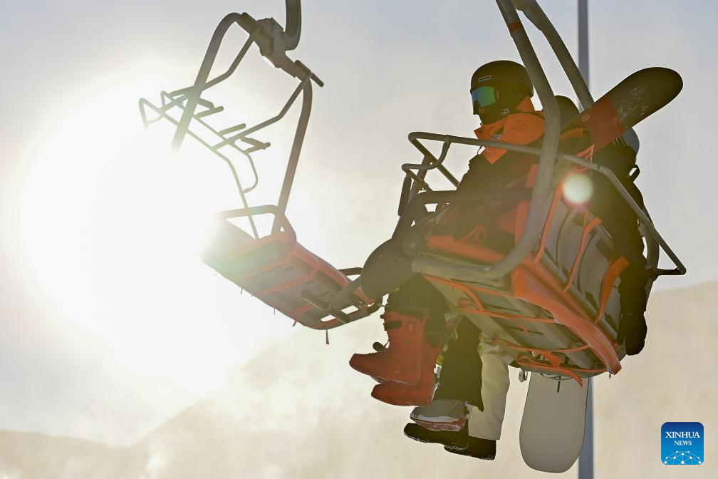 Ski enthusiasts take a cable car at Jiangjun Mountain ski resort in Altay, northwest China's Xinjiang Uygur Autonomous Region, Dec. 19, 2023. Altay is emerging as a popular ski destination as its three ski resorts - Jiangjun Mountain, Koktokay and Jikepulin - offer better terrain variety and a longer ski season. (Xinhua/Ding Lei)