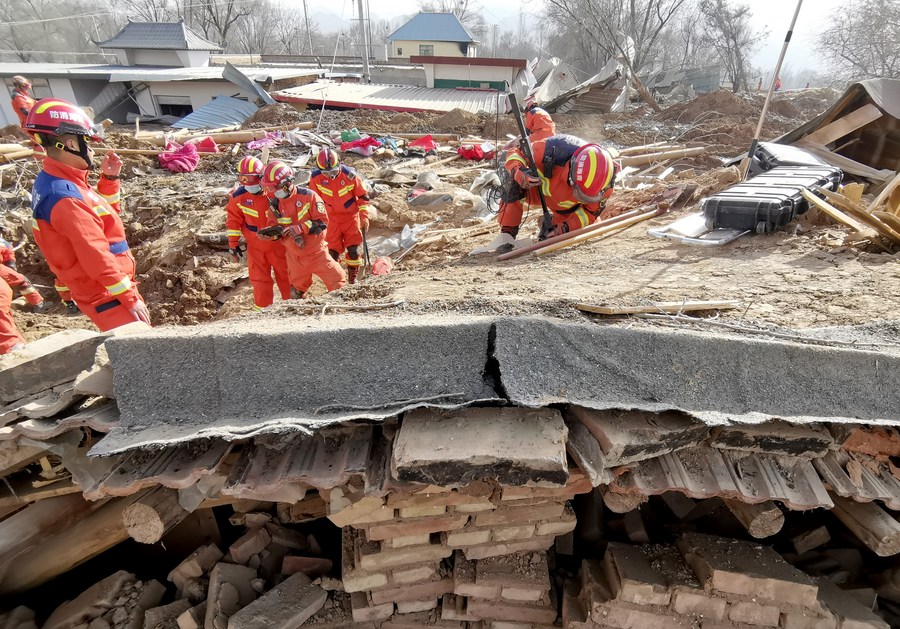 Rescuers are in operation at Meiyi Village of Minhe County, northwest China's Qinghai Province, Dec. 19, 2023. (Xinhua/Zhang Ling)