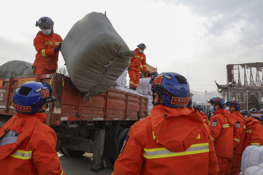 Rescuers unload relief materials at a temporary relocation site in Dahe Village of Bonan-Dongxiang-Salar Autonomous County of Jishishan, Linxia Hui Autonomous Prefecture, northwest China's Gansu Province, Dec. 19, 2023. (Xinhua/Fang Xin)