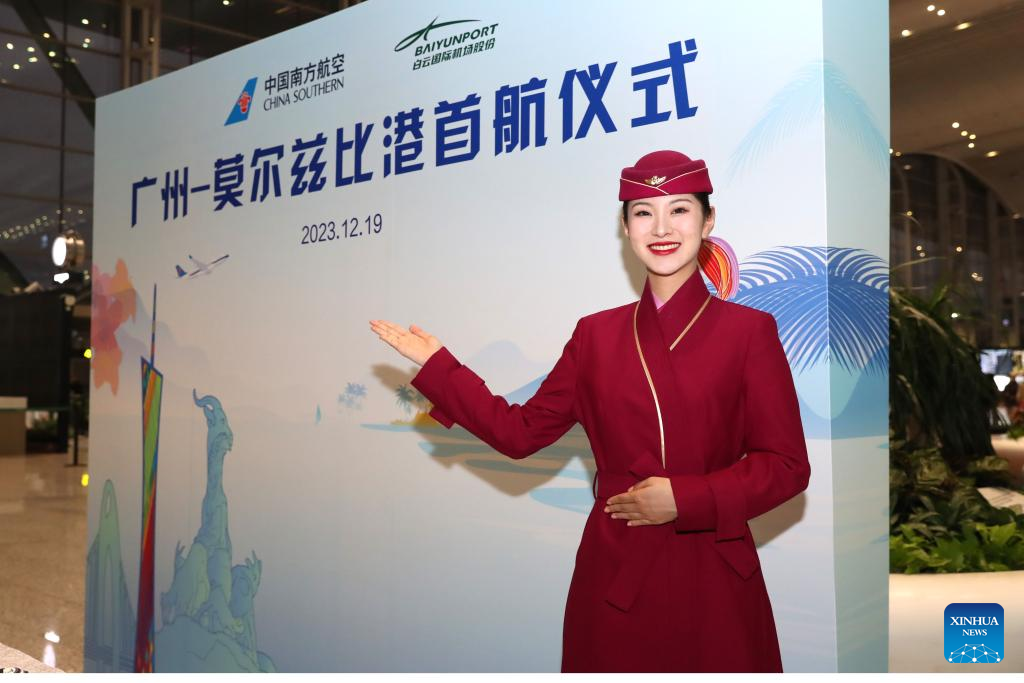 A flight attendant takes part in a ceremony marking the first regular commercial air route connecting south China's Guangzhou and Port Moresby, the capital of Papua New Guinea (PNG), in Guangzhou, south China's Guangdong Province, Dec. 19, 2023. China Southern Airlines launched a direct passenger route linking south China's Guangzhou and Port Moresby, the capital of Papua New Guinea (PNG), on Wednesday. (Photo by Xiao Meng/Xinhua)