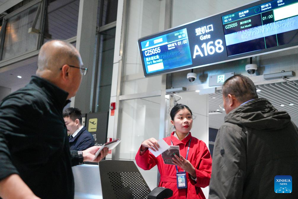 Passengers taking flight CZ5055 to Port Moresby, the capital of Papua New Guinea (PNG), check in at the Guangzhou Baiyun International Airport in Guangzhou, south China's Guangdong Province, Dec. 19, 2023. China Southern Airlines launched a direct passenger route linking south China's Guangzhou and Port Moresby, the capital of Papua New Guinea (PNG), on Wednesday. (Photo by Xiao Meng/Xinhua)