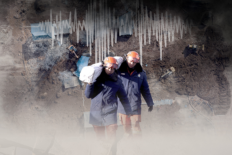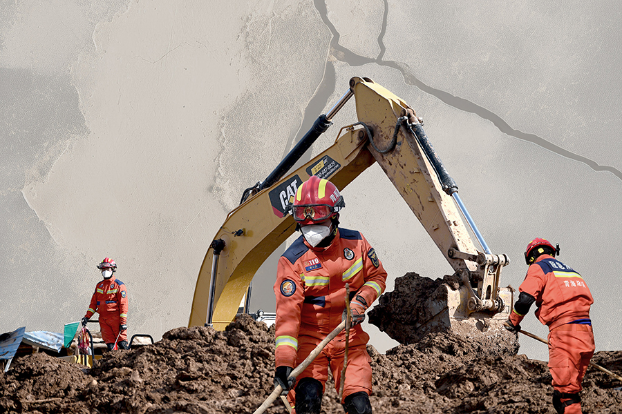 Rescuers search for survivors on Wednesday in Minhe county, Haidong, Qinghai province, after a sand boil triggered by Monday's earthquake left homes buried in mud and debris. Many houses that survived the temblor sank to the ground after the sand boil, a natural phenomenon that occurs when groundwater under pressure after an earthquake comes out to penetrate the sandy layer. TIAN WEITAO/FOR CHINA DAILY