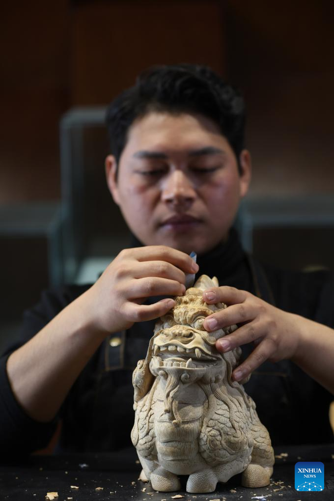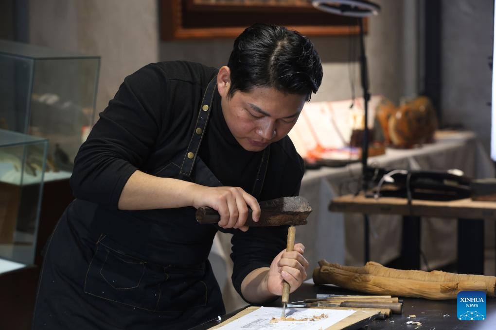 Tang Shuhui makes a woodcarving artwork in Shexian County of Huangshan, east China's Anhui Province, Dec. 18, 2023.?(Xinhua/Zhou Mu)