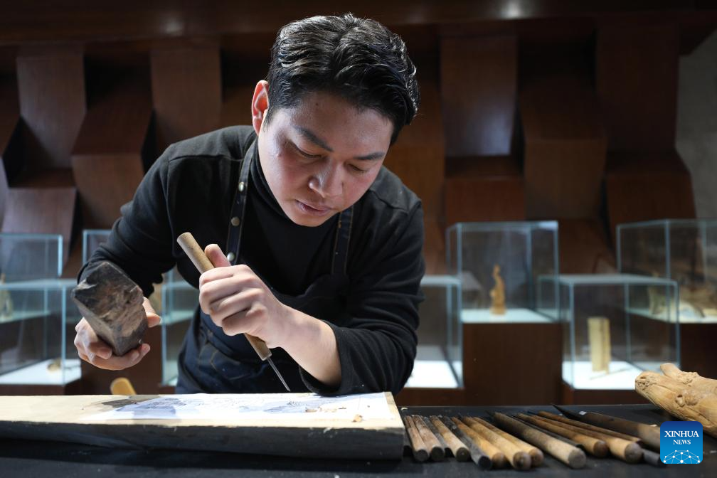 Tang Shuhui makes a woodcarving artwork in Shexian County of Huangshan, east China's Anhui Province, Dec. 14, 2023.?(Photo by Fan Chengzhu/Xinhua)