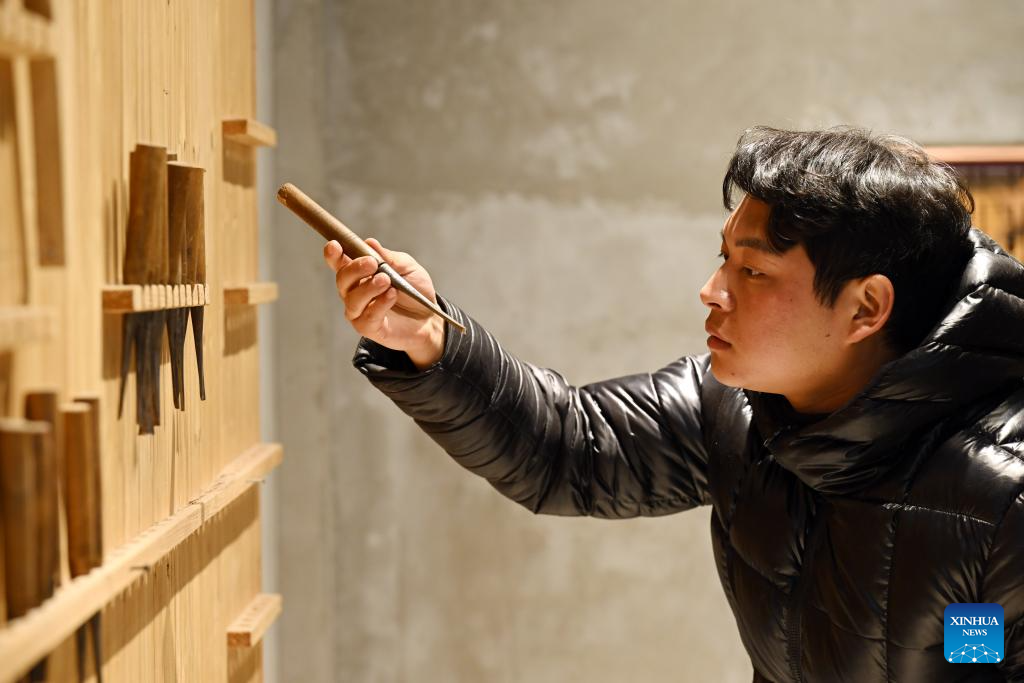 Tang Shuhui arranges his woodcarving knives in Shexian County of Huangshan, east China's Anhui Province, Dec. 18, 2023.?(Xinhua/Zhou Mu)