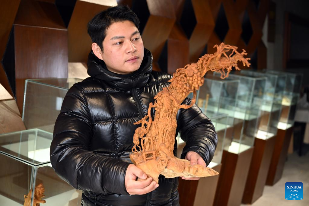 Tang Shuhui displays his woodcarving artwork in Shexian County of Huangshan, east China's Anhui Province, Dec. 18, 2023.?(Xinhua/Zhou Mu)