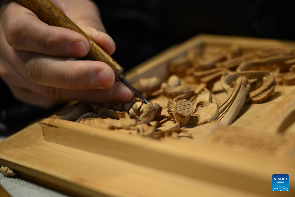 Tang Shuhui is a municipal-level inheritor of Huizhou woodcarving in Shexian County of Huangshan. Featuring vivid carving images and delicate carving techniques, his woodcarving artworks have reaped many awards. To promote his woodcarving artworks in the market, Tang has set up a team to develop cultural and creative products, as well as promoting his products via livestreaming, thus making it known to the young generation. "I hope through my continuous learning and creating, I could make a step forward in my design and craftsmanship," said Tang.