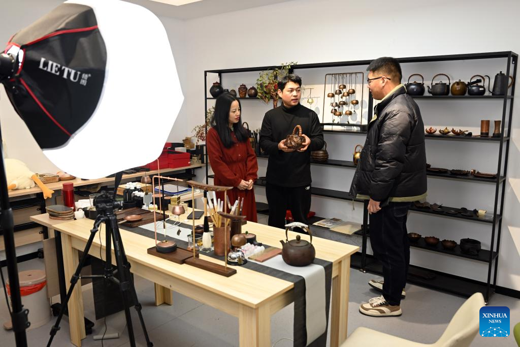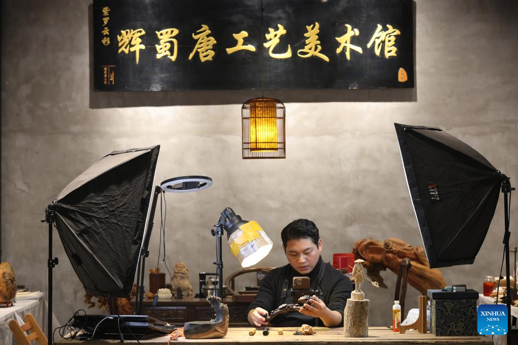 Tang Shuhui promotes woodcarving artworks via livestreaming at his studio in Shexian County of Huangshan, east China's Anhui Province, Dec. 14, 2023.?(Photo by Fan Chengzhu/Xinhua)