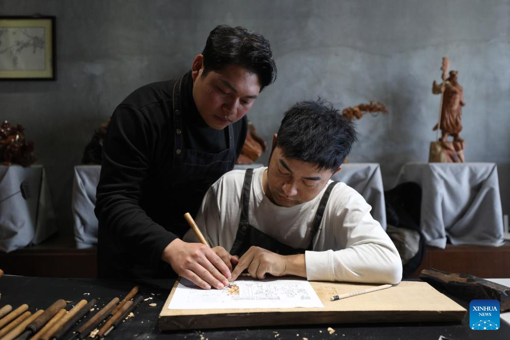 Tang Shuhui (L) instructs his apprentice to make a woodcarving artwork in Shexian County of Huangshan, east China's Anhui Province, Dec. 14, 2023. (Photo by Fan Chengzhu/Xinhua)