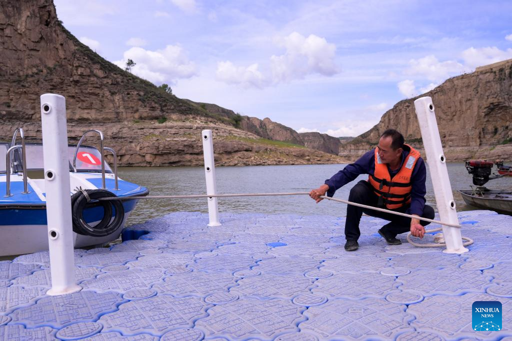 A speedboat driver docks his boat in Laoniuwan, a border area between Qingshuihe County of north China's Inner Mongolia Autonomous Region and Pianguan County of north China's Shanxi Province, Aug. 26, 2023. In recent years, Laoniuwan Town in Qingshuihe County has taken advantage of the unique geographic location of Laoniuwan area, which is situated at the confluence of the Great Wall and the Yellow River, and vigorously supported tourism industry by developing entertainment projects to attract more visitors. (Xinhua/Li Zhipeng)