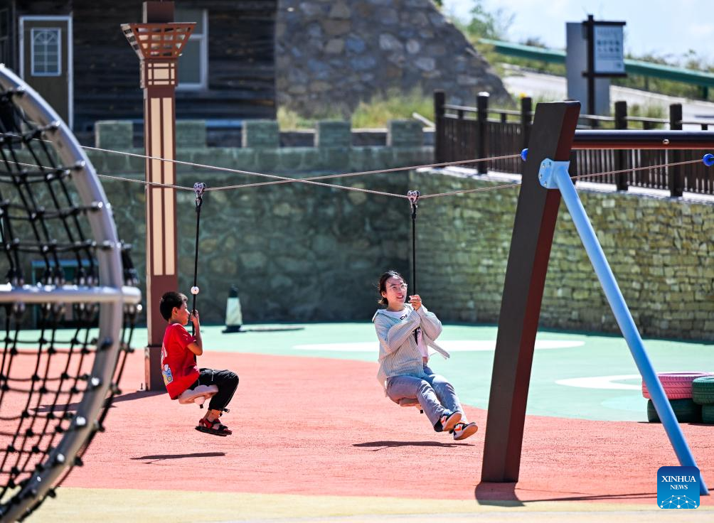 Tourists enjoy leisure time at an amusement park in Laoniuwan, a border area between Qingshuihe County of north China's Inner Mongolia Autonomous Region and Pianguan County of north China's Shanxi Province, Aug. 24, 2023. In recent years, Laoniuwan Town in Qingshuihe County has taken advantage of the unique geographic location of Laoniuwan area, which is situated at the confluence of the Great Wall and the Yellow River, and vigorously supported tourism industry by developing entertainment projects to attract more visitors. (Xinhua/Lian Zhen)