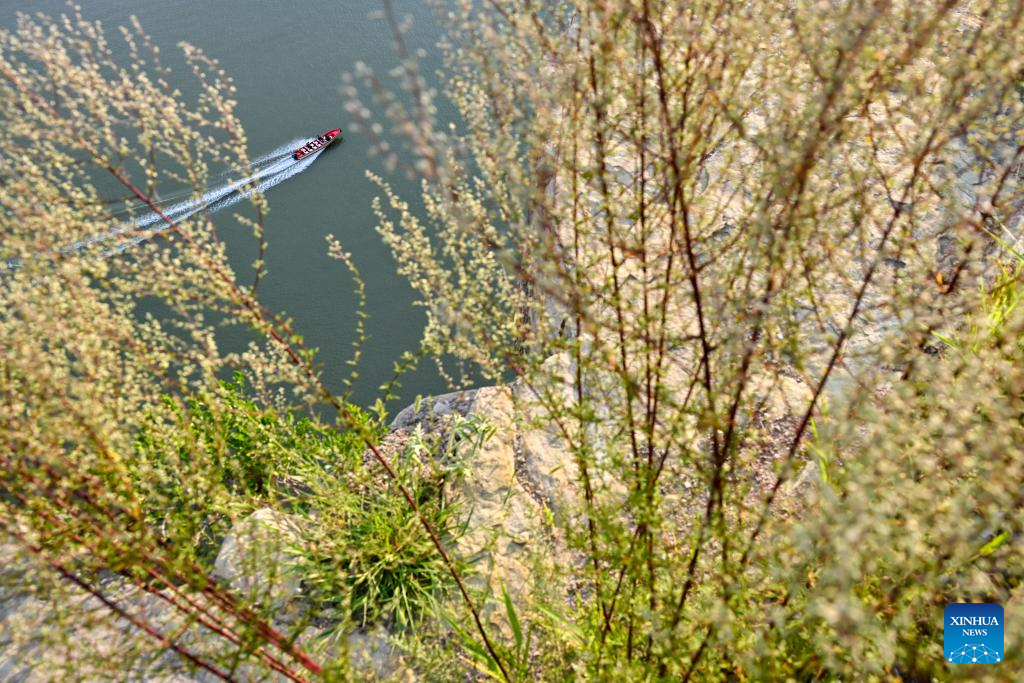 This aerial photo taken on Aug. 23, 2023 shows tourists taking a speedboat for sightseeing in Laoniuwan, a border area between Qingshuihe County of north China's Inner Mongolia Autonomous Region and Pianguan County of north China's Shanxi Province. In recent years, Laoniuwan Town in Qingshuihe County has taken advantage of the unique geographic location of Laoniuwan area, which is situated at the confluence of the Great Wall and the Yellow River, and vigorously supported tourism industry by developing entertainment projects to attract more visitors. (Xinhua/Liu Jinhai)