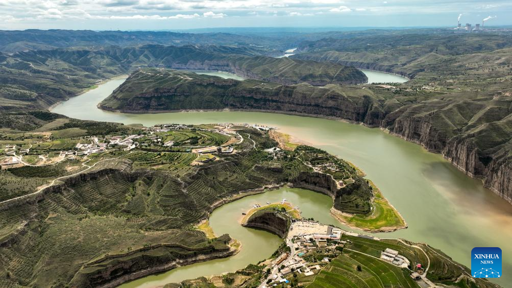 This aerial photo taken on Aug. 26, 2023 shows a view of Laoniuwan, a border area between Qingshuihe County of north China's Inner Mongolia Autonomous Region and Pianguan County of north China's Shanxi Province. In recent years, Laoniuwan Town in Qingshuihe County has taken advantage of the unique geographic location of Laoniuwan area, which is situated at the confluence of the Great Wall and the Yellow River, and vigorously supported tourism industry by developing entertainment projects to attract more visitors. (Xinhua/Liu Jinhai)