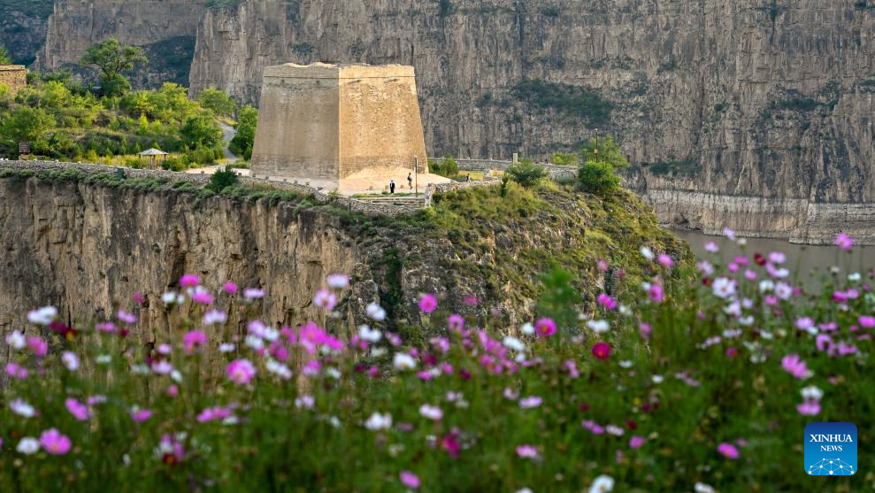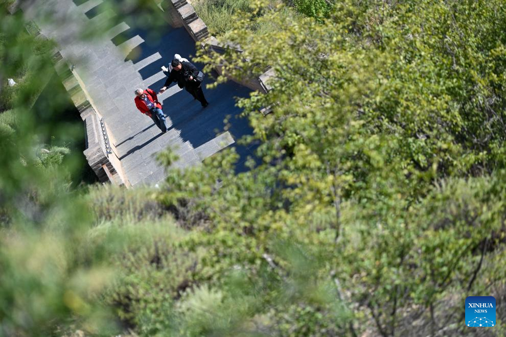 This photo taken on Aug. 23, 2023 shows a section of the Great Wall built during the Ming Dynasty (1368-1644) in Laoniuwan, a border area between Qingshuihe County of north China's Inner Mongolia Autonomous Region and Pianguan County of north China's Shanxi Province. In recent years, Laoniuwan Town in Qingshuihe County has taken advantage of the unique geographic location of Laoniuwan area, which is situated at the confluence of the Great Wall and the Yellow River, and vigorously supported tourism industry by developing entertainment projects to attract more visitors. (Xinhua/Liu Jinhai)