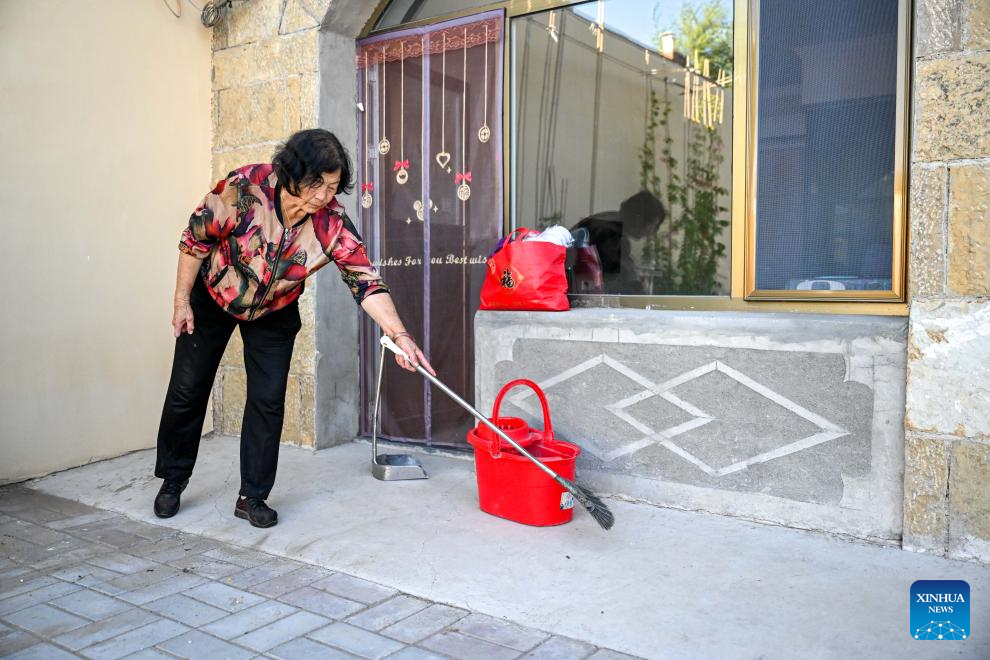 A homestay owner cleans the yard in Laoniuwan, a border area between Qingshuihe County of north China's Inner Mongolia Autonomous Region and Pianguan County of north China's Shanxi Province, Aug. 24, 2023. In recent years, Laoniuwan Town in Qingshuihe County has taken advantage of the unique geographic location of Laoniuwan area, which is situated at the confluence of the Great Wall and the Yellow River, and vigorously supported tourism industry by developing entertainment projects to attract more visitors. (Xinhua/Lian Zhen)