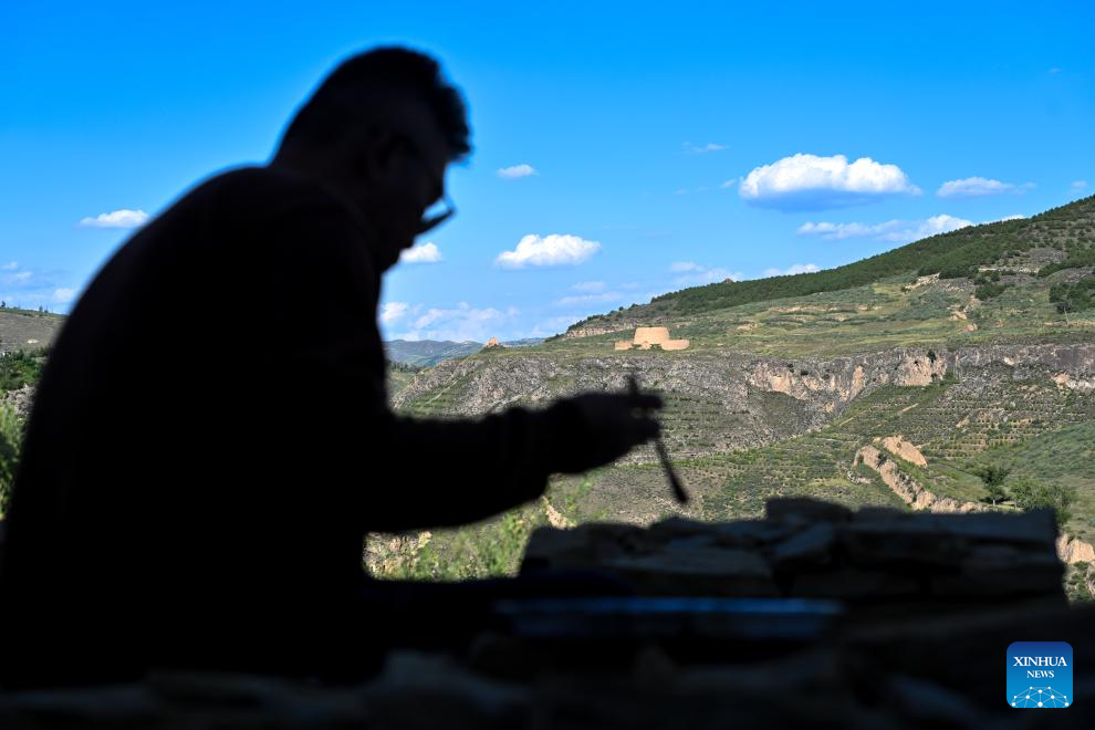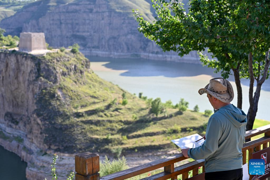 An artist paints in Laoniuwan, a border area between Qingshuihe County of north China's Inner Mongolia Autonomous Region and Pianguan County of north China's Shanxi Province, Aug. 24, 2023. In recent years, Laoniuwan Town in Qingshuihe County has taken advantage of the unique geographic location of Laoniuwan area, which is situated at the confluence of the Great Wall and the Yellow River, and vigorously supported tourism industry by developing entertainment projects to attract more visitors. (Xinhua/Liu Jinhai)