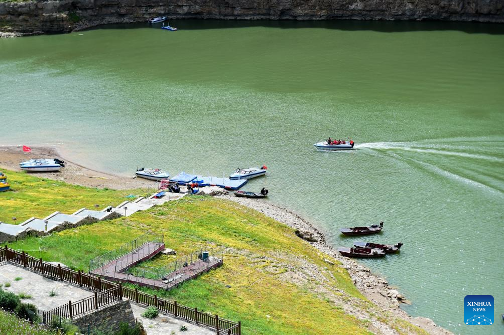 Tourists take a speedboat for sightseeing in Laoniuwan, a border area between Qingshuihe County of north China's Inner Mongolia Autonomous Region and Pianguan County of north China's Shanxi Province, Aug. 26, 2023. In recent years, Laoniuwan Town in Qingshuihe County has taken advantage of the unique geographic location of Laoniuwan area, which is situated at the confluence of the Great Wall and the Yellow River, and vigorously supported tourism industry by developing entertainment projects to attract more visitors. (Xinhua/Li Zhipeng)