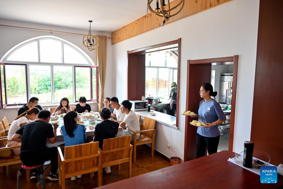 Tourists have a meal at a homestay in Laoniuwan, a border area between Qingshuihe County of north China's Inner Mongolia Autonomous Region and Pianguan County of north China's Shanxi Province, Aug. 26, 2023. In recent years, Laoniuwan Town in Qingshuihe County has taken advantage of the unique geographic location of Laoniuwan area, which is situated at the confluence of the Great Wall and the Yellow River, and vigorously supported tourism industry by developing entertainment projects to attract more visitors. (Xinhua/Liu Jinhai)