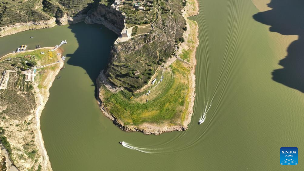 This aerial photo taken on Aug. 24, 2023 shows tourists taking speedboats for sightseeing in Laoniuwan, a border area between Qingshuihe County of north China's Inner Mongolia Autonomous Region and Pianguan County of north China's Shanxi Province. In recent years, Laoniuwan Town in Qingshuihe County has taken advantage of the unique geographic location of Laoniuwan area, which is situated at the confluence of the Great Wall and the Yellow River, and vigorously supported tourism industry by developing entertainment projects to attract more visitors. (Xinhua/Liu Jinhai)