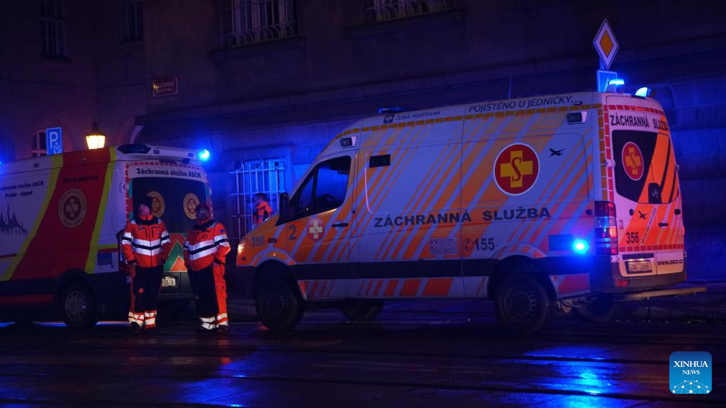 An ambulance is seen near the site of a shooting in Prague, the Czech Republic, on Dec. 21, 2023. At least 15 people were killed in a shooting at a school in the Czech capital Prague on Thursday, local police said. (Photo by DanaKesnerova/Xinhua)