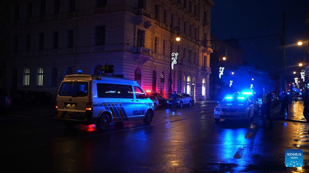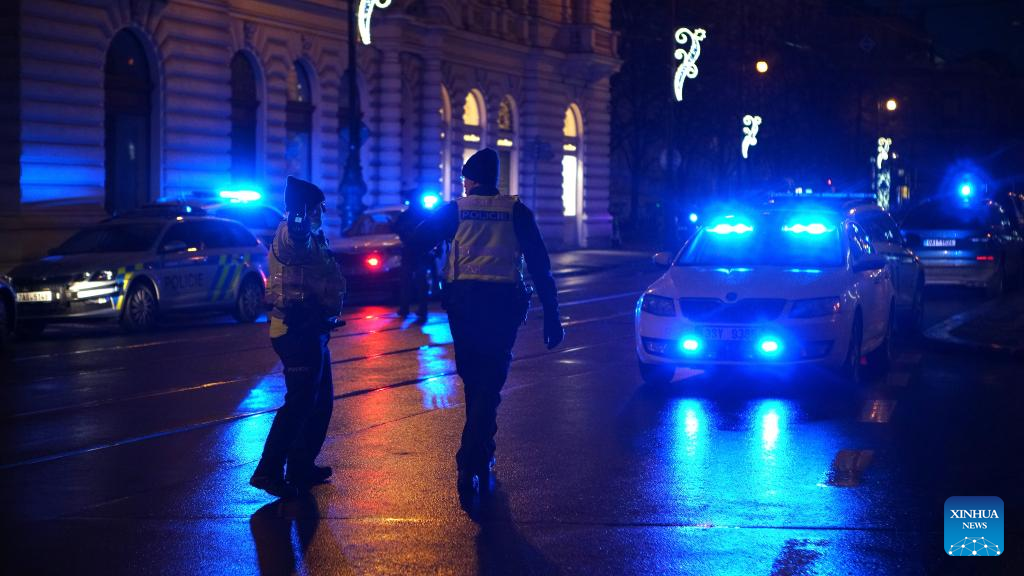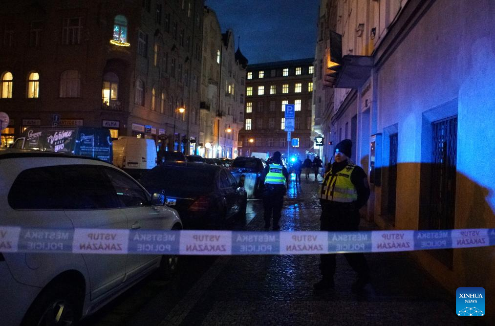 Police officers work near the site of a shooting in Prague, the Czech Republic, on Dec. 21, 2023. At least 15 people were killed in a shooting at a school in the Czech capital Prague on Thursday, local police said. (Photo by DanaKesnerova/Xinhua)