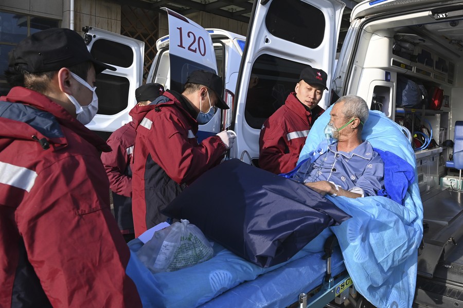 First-aid personnel transfer a critically injured resident to an ambulance at the People's Hospital of Linxia Hui Autonomous Prefecture in northwest China's Gansu Province, Dec. 21, 2023. (Xinhua/Fan Peishen)