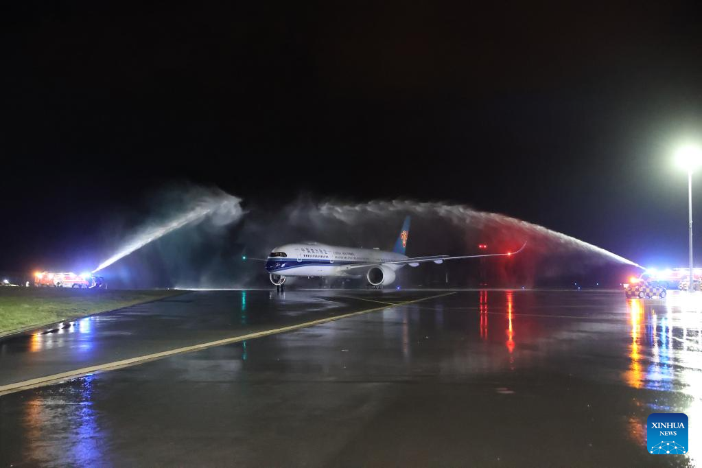 A passenger plane from China is welcomed by a water cannon salute at Luxembourg Airport, Luxembourg, Dec. 21, 2023. A plane carrying 146 passengers landed at Luxembourg Airport on Thursday evening, marking the opening of the first direct air route for passengers between China and Luxembourg. (Xinhua/Zhao Dingzhe)