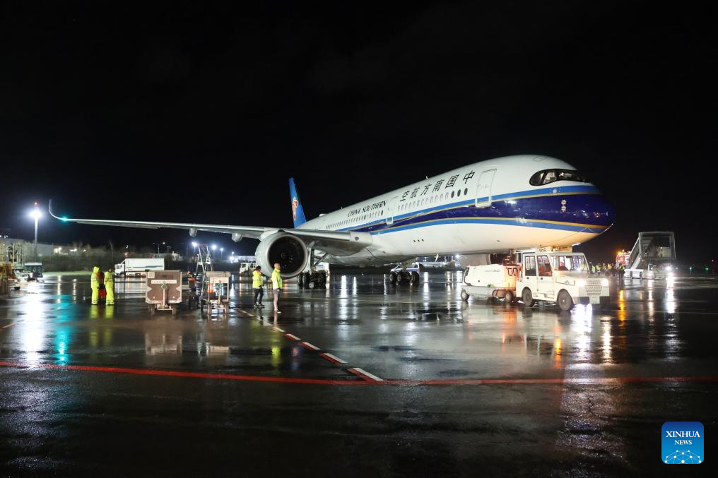 A passenger plane from China arrives at Luxembourg Airport, Luxembourg, Dec. 21, 2023. A plane carrying 146 passengers landed at Luxembourg Airport on Thursday evening, marking the opening of the first direct air route for passengers between China and Luxembourg. (Xinhua/Zhao Dingzhe)