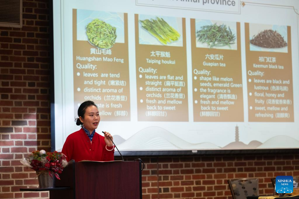 A staff member introduces tea culture during the 2023 Anhui Culture and Tourism Promotion event in Maryland, the United States, on Dec. 19, 2023. (Xinhua/Liu Jie)