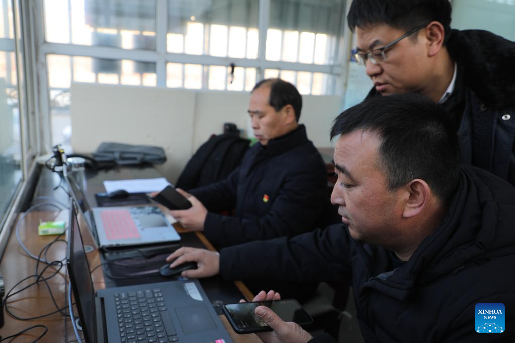 Teachers and staff members prepare for online lectures to students in Jishishan County, northwest China's Gansu Province, Dec. 22, 2023. Classes have been resumed for high school students via online teaching in Jishishan County after a 6.2-magnitude earthquake late Monday. (Xinhua/Zhang Zhimin)