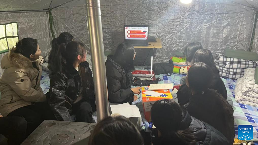 High school students take online lectures at a temporary relocation site in Jishishan County, northwest China's Gansu Province, Dec. 22, 2023. Classes have been resumed for high school students via online teaching in Jishishan County after a 6.2-magnitude earthquake late Monday. (Xinhua)