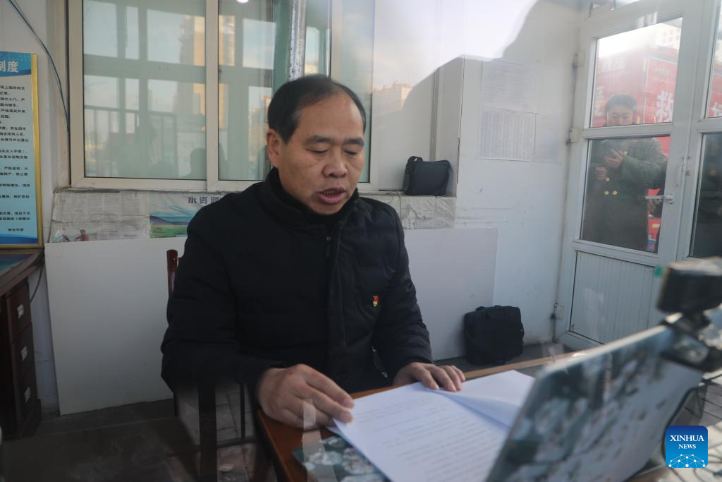 Dong Honghai, headmaster of Jishi Middle School, gives an online lecture to students in Jishishan County, northwest China's Gansu Province, Dec. 22, 2023. Classes have been resumed for high school students via online teaching in Jishishan County after a 6.2-magnitude earthquake late Monday. (Xinhua/Zhang Zhimin)