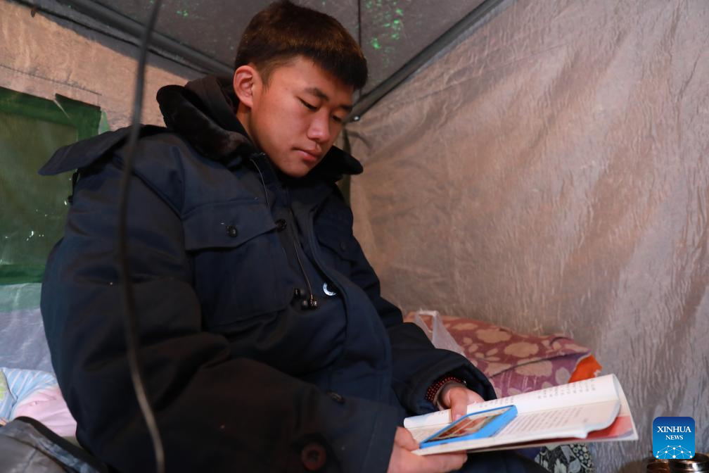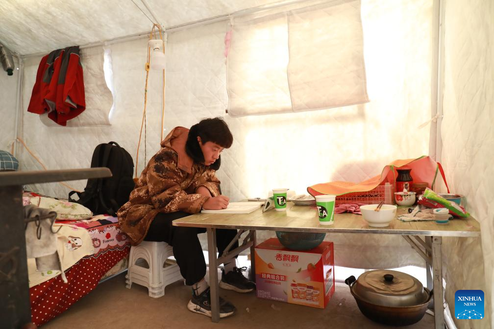 A high school student takes online lectures at a temporary relocation site in Jishishan County, northwest China's Gansu Province, Dec. 22, 2023. Classes have been resumed for high school students via online teaching in Jishishan County after a 6.2-magnitude earthquake late Monday. (Xinhua/Zhang Rui)