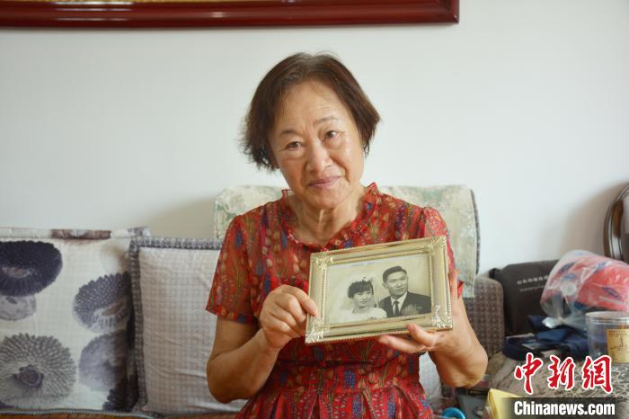 Shen Yuying shows a wedding photo of her and her husband. (Photo/Lyu Yan)
