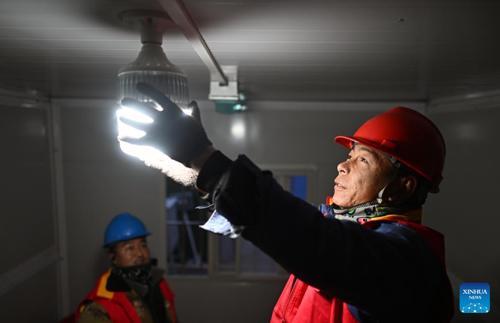 Staff members of State Grid Qinghai branch install a bulb at a prefabricated house of a temporary relocation site in Lajia Village, Guanting Township, Minhe County in Haidong City, northwest China's Qinghai Province, Dec. 22, 2023. Sufficient supplies were prepared to ensure a warm winter solstice for quake-affected people at the temporary relocation sites. (Xinhua/Zhang Hongxiang)