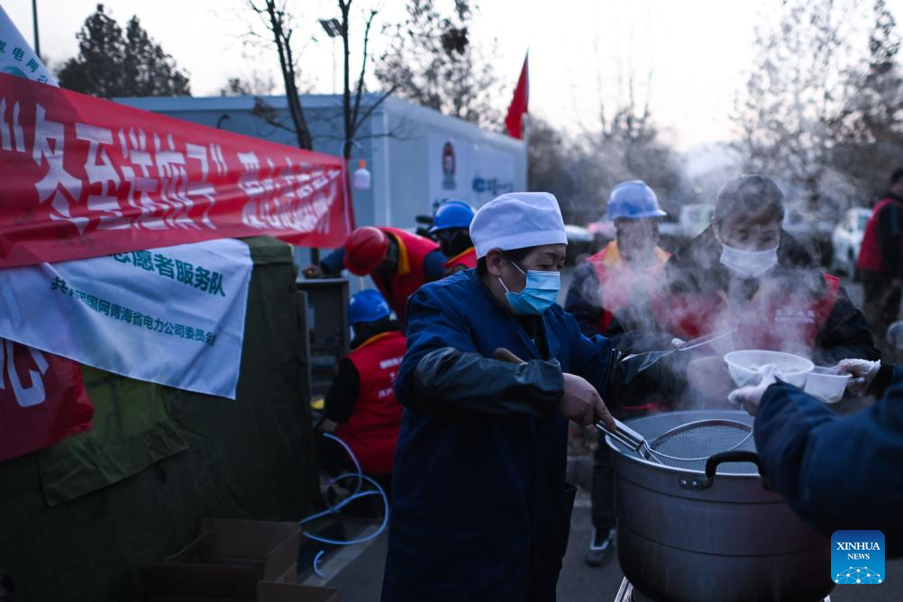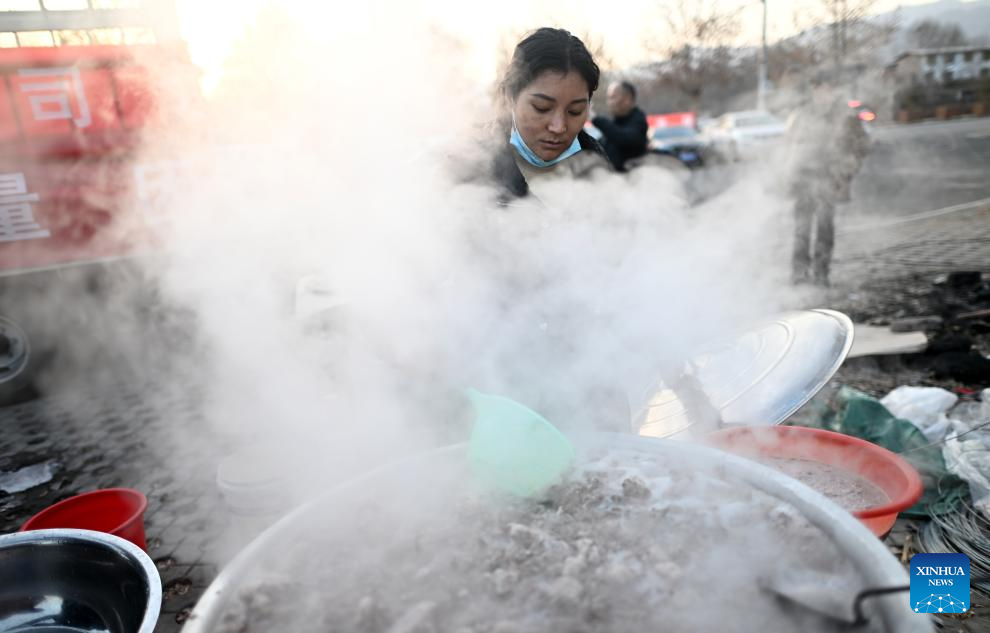 A woman prepares dinner for quake-affected people at a temporary relocation site in Lajia Village, Guanting Township, Minhe County in Haidong City, northwest China's Qinghai Province, Dec. 22, 2023. Sufficient supplies were prepared to ensure a warm winter solstice for quake-affected people at the temporary relocation sites. (Xinhua/Zhang Hongxiang)