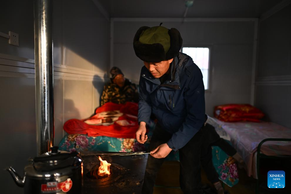 Villager Li Guien adds coal to a stove at a prefabricated house of a temporary relocation site in Lajia Village, Guanting Township, Minhe County in Haidong City, northwest China's Qinghai Province, Dec. 22, 2023. Sufficient supplies were prepared to ensure a warm winter solstice for quake-affected people at the temporary relocation sites. (Xinhua/Zhang Hongxiang)