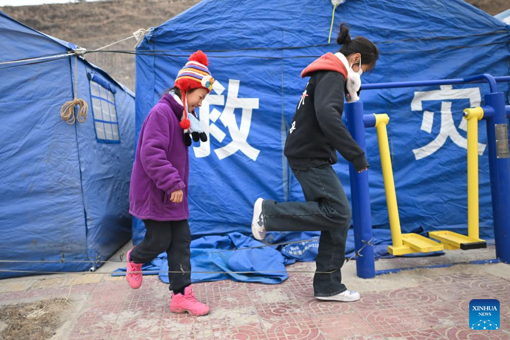 Children play at a temporary relocation site in Yamu Village, Salar Autonomous County of Xunhua, northwest China's Qinghai Province, Dec. 22, 2023. Sufficient supplies were prepared to ensure a warm winter solstice for quake-affected people at the temporary relocation sites. (Xinhua/Zhang Long)
