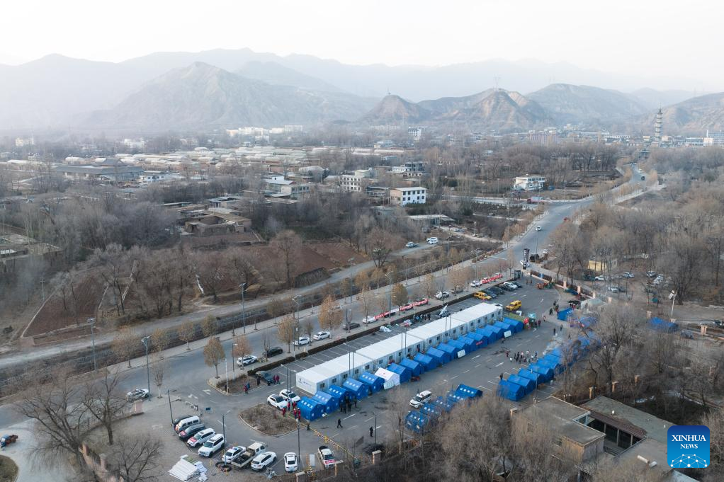 This aerial photo shows a temporary relocation site in Lajia Village, Guanting Township, Minhe County in Haidong City, northwest China's Qinghai Province, Dec. 22, 2023. Sufficient supplies were prepared to ensure a warm winter solstice for quake-affected people at the temporary relocation sites. (Xinhua/Zhang Long)