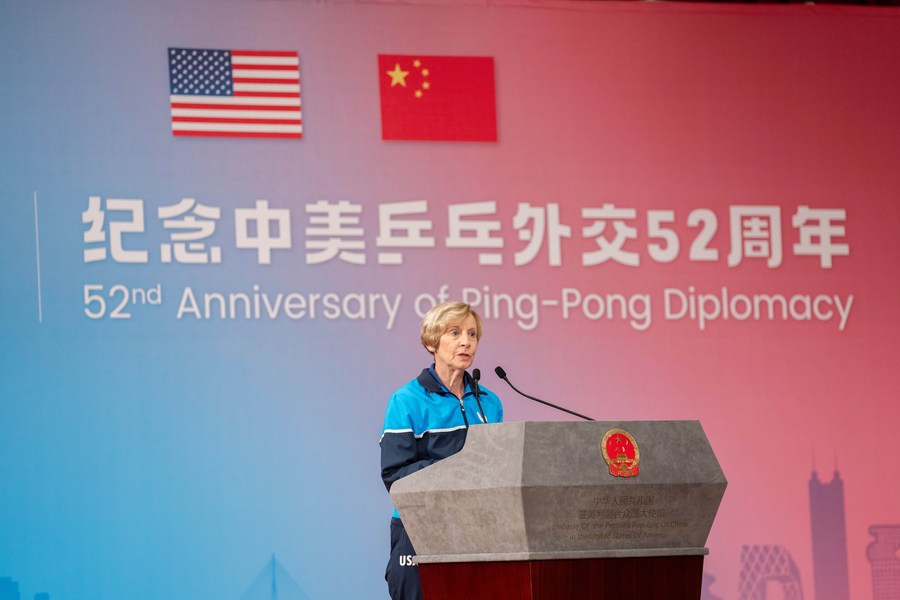 Connie Sweeris, American table tennis champion who went on the ice-breaking trip to China in 1971, delivers a speech during an event held by the Chinese Embassy in the United States to commemorate the 52nd anniversary of Ping-Pong Diplomacy in Washington, D.C., the United States, Dec. 13, 2023. (Xinhua/Liu Jie)