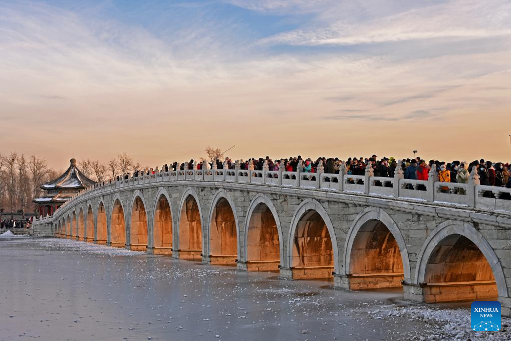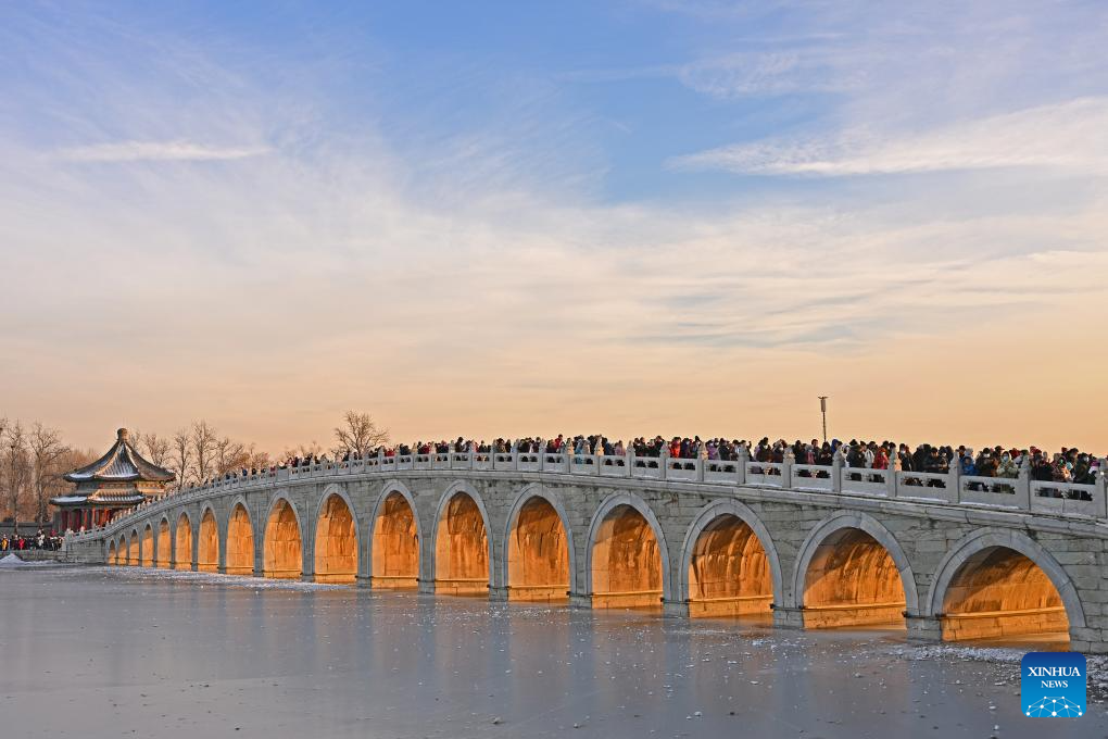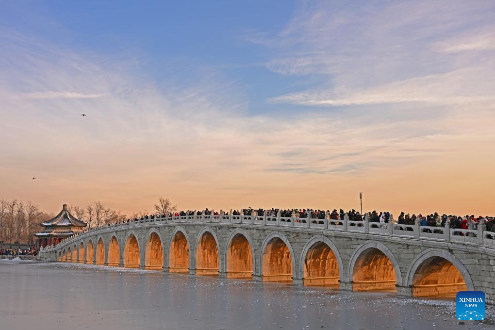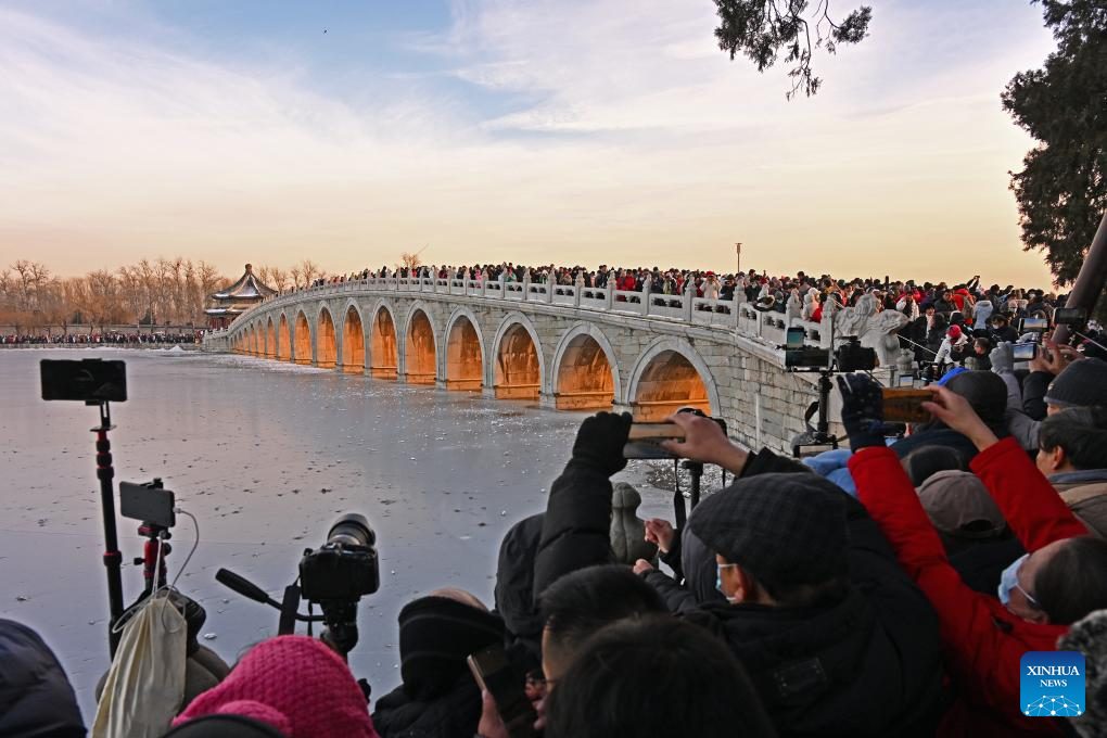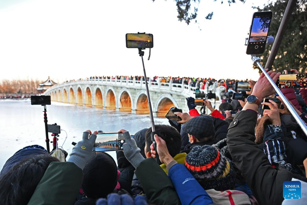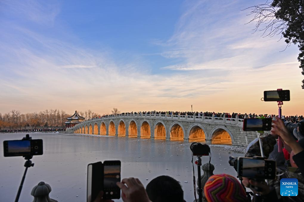 Visitors take pictures of the Seventeen-Arch Bridge with the sunset glow shining through its arches at the Summer Palace in Beijing, capital of China, Dec. 22, 2023. (Xinhua/Li Xin)
