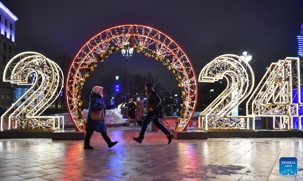 People walk past New Year decorations in central Moscow, Russia, Dec. 22, 2023. (Photo by Alexander Zemlianichenko Jr/Xinhua)