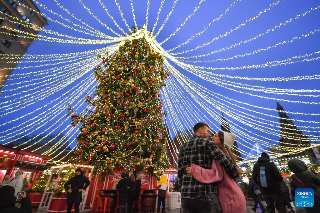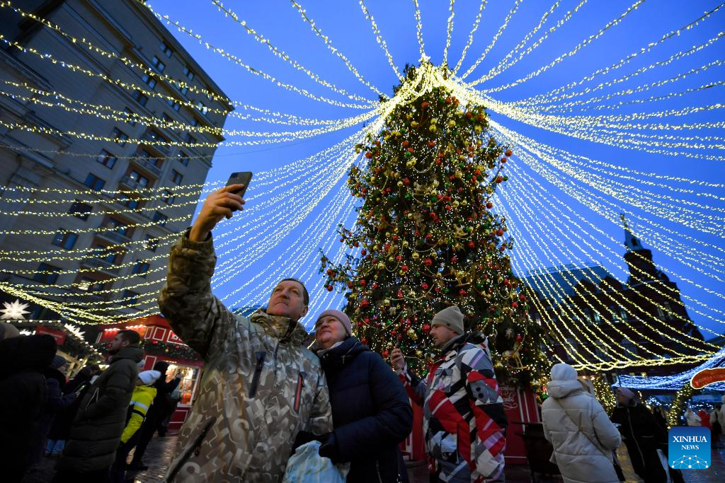 New Year decorations are seen in central Moscow, Russia, Dec. 22, 2023. (Photo by Alexander Zemlianichenko Jr/Xinhua)