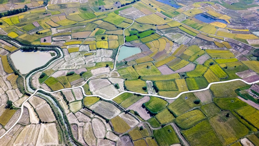 This aerial photo taken on Sept. 27, 2018 shows agricultural fields in Xiaogang Village, Fengyang County, east China's Anhui Province. (Xinhua/Zhang Duan)
