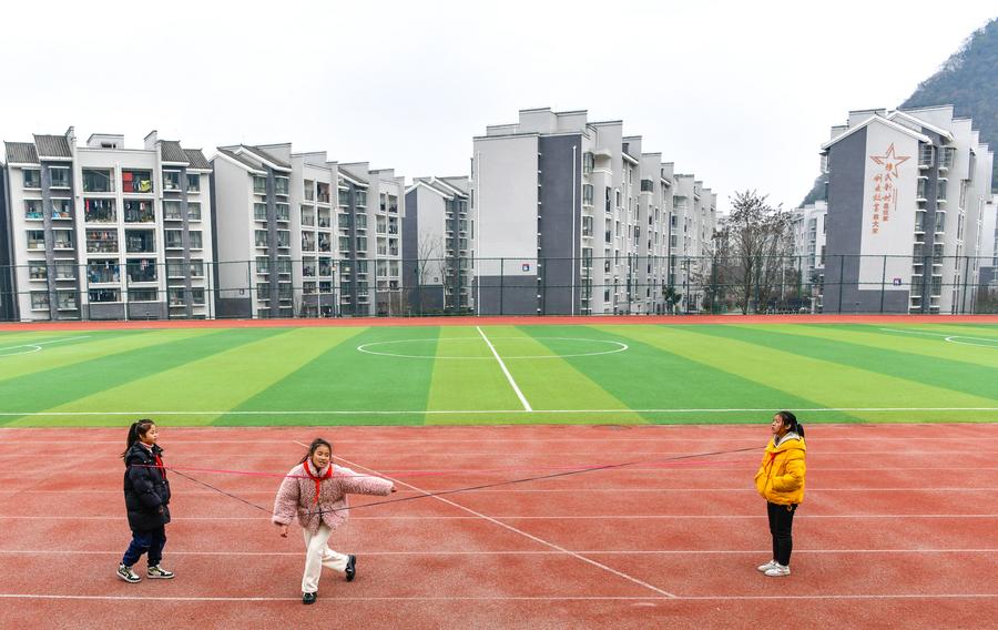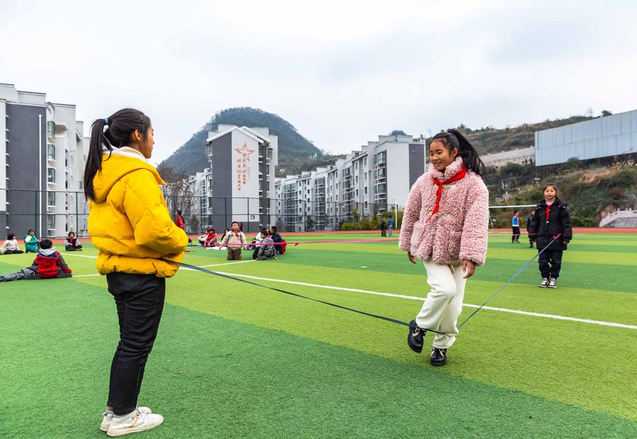 Ji Xue (C) plays with classmates at school, with their relocated homes in the back, in Xixiu District of Anshun City, southwest China's Guizhou Province, Dec. 22, 2023. (Xinhua/Yang Wenbin)