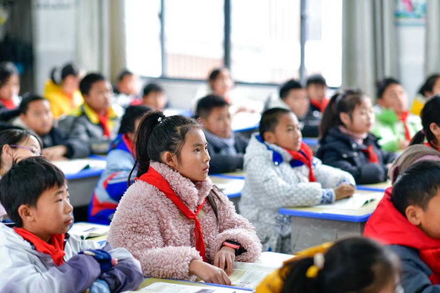 Ji Xue (2nd L) attends a class at school in Xixiu District of Anshun City, southwest China's Guizhou Province, Dec. 22, 2023. (Xinhua/Yang Wenbin)